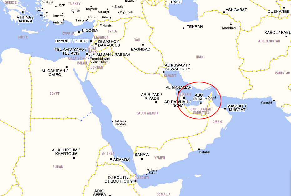 Abu Dhabi. Ubicación geográfica en el este de la península Arábiga.